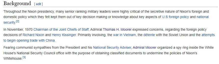 Moorer-Radford Affair. Over the years it has come out that the US Military was spying on the Nixon White House. Navy Admiral Thomas H. Moorer set up a spy ring inside the White House because his suspected that Nixon’s administration had been infiltrated by Kissinger and his globalist ideologies and these policies were not in America’s best interests.
