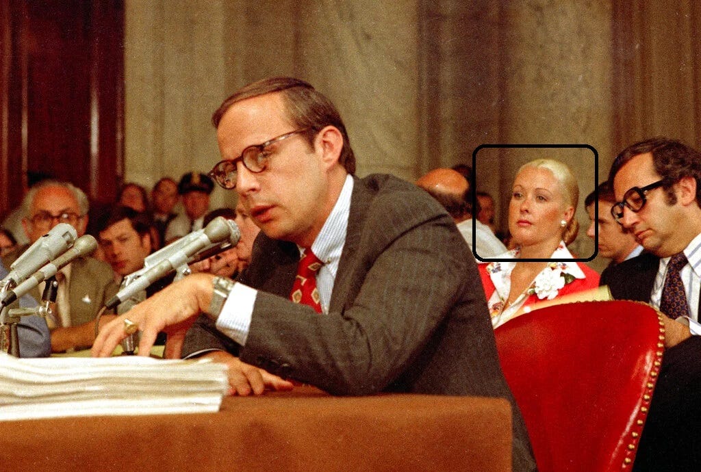 This is because his fiancé (they eventually did get married) at the time Maurine “Mo” Biner. Mo was the very attractive blonde woman that sat behind Dean at the congressional hearings for Watergate.