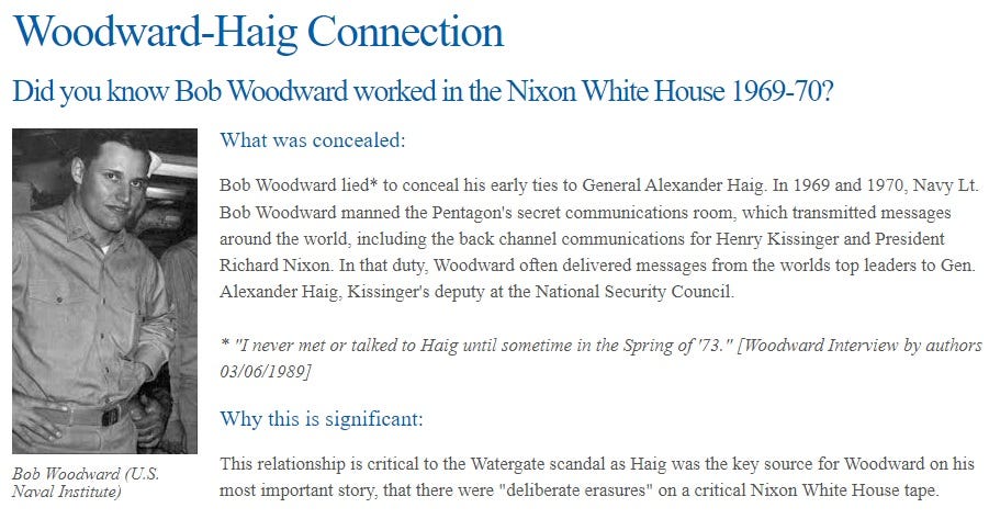 As previously mentioned, Washington Post cub reporter Robert Woodward had ties to Adm. Thomas H. Moorer, the Chief of Naval Operations ( future Chairman Joint Chiefs), Alexander Haig as well as Radford. Was Woodward explicitly or implicitly part of the Whitehouse Spy Ring?